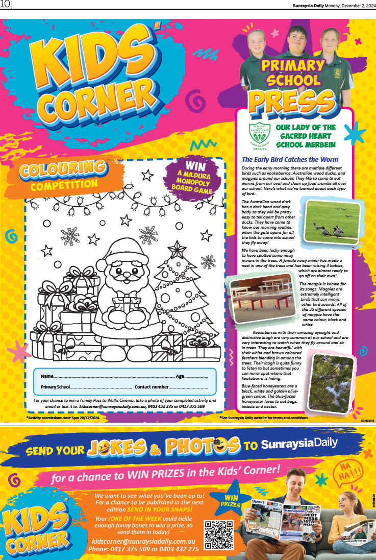 During the early morning there are multiple different birds such as kookaburras, Australian wood ducks, and magpies around our school. They like to come to eat worms from our oval and clean up food crumbs all over our school. Here’s what we’ve learned about each type of bird: