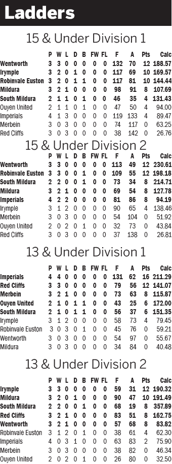 BEST: Mildura: Malia McAullay, Riley O’Callaghan. Ouyen United: Tessa Brown, Mahli Jardine.